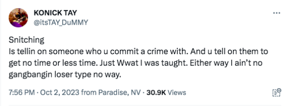 “Snitching Is tellin on someone who u commit a crime with. And u tell on them to get no time or less time. Just Wwat I was taught. Either way I ain’t no gangbangin loser type no way.”