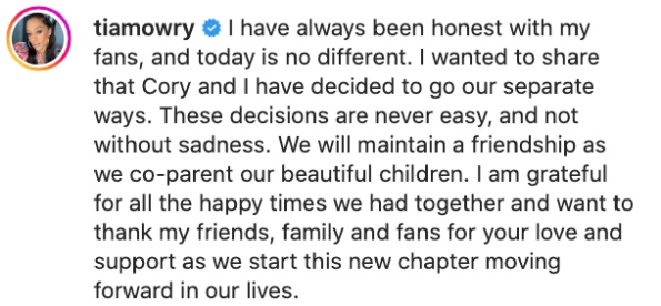 “I have always been honest with my fans, and today is no different. I wanted to share that Cory and I have decided to go our separate ways. These decisions are never easy, and not without sadness. We will maintain a friendship as we co-parent our beautiful children. I am grateful for all the happy times we had together and want to thank my friends, family and fans for your love and support as we start this new chapter moving forward in our lives.”