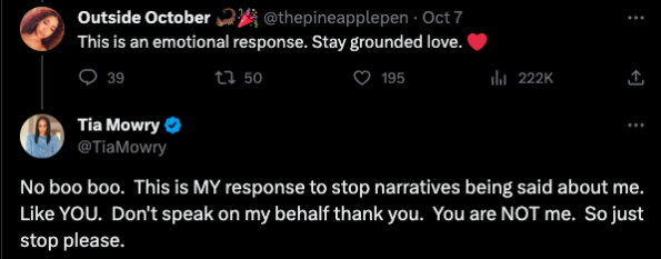 “No boo boo. This is MY response to stop narratives being said about me. Like YOU. Don’t speak on my behalf thank you. You are NOT me. So just stop please.”