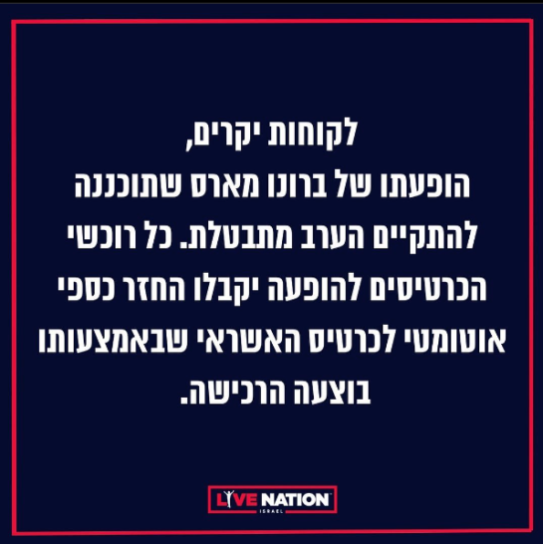 “Dear customers, Bruno Mars concert scheduled to take place tonight is canceled,” a translated Instagram statement from Live Nation Israel read on Friday. “All ticket purchases to the show will receive an automatic refund to the credit card through which the purchase was made. We strengthen the residents of Israel, IDF fighters and the security forces in these difficult moments.”