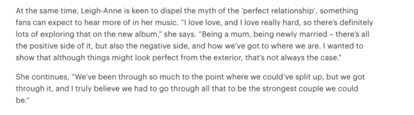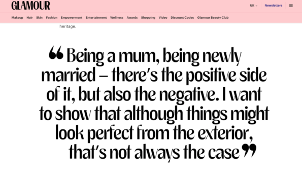 “Being a mum, being newly married – there’s all the positive side of it, but also the negative side, and how we’ve got to where we are. I wanted to show that although things might look perfect from the exterior, that’s not always the case.”