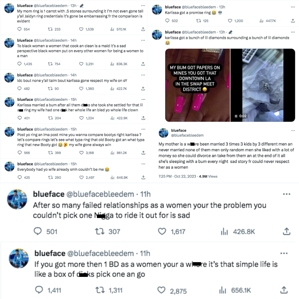 Blueface clapped back in a full-blown rant from his X account, comparing rings and mentioning his mother’s sexual history. He fired,