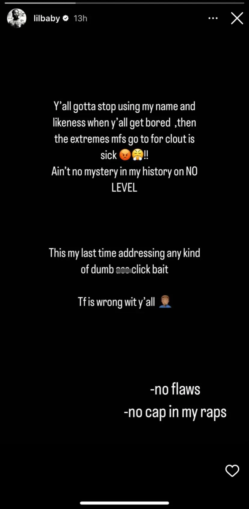 “This my last time addressing any kind of dumb a** click bait. Tf is wrong with y’all. No flaws. No cap in my raps.”