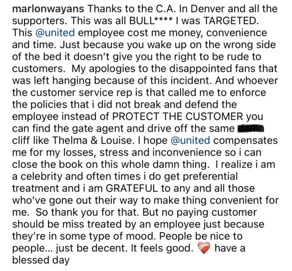 “Thanks to the C.A. In Denver and all the supporters. This was all BULL**** I was TARGETED. This @united employee cost me money, convenience and time. Just because you wake up on the wrong side of the bed it doesn’t give you the right to be rude to customers. My apologies to the disappointed fans that was left hanging because of this incident. And whoever the customer service rep is that called me to enforce the policies that i did not break and defend the employee instead of PROTECT THE CUSTOMER you can find the gate agent and drive off the same d*mn cliff like Thelma & Louise.”
