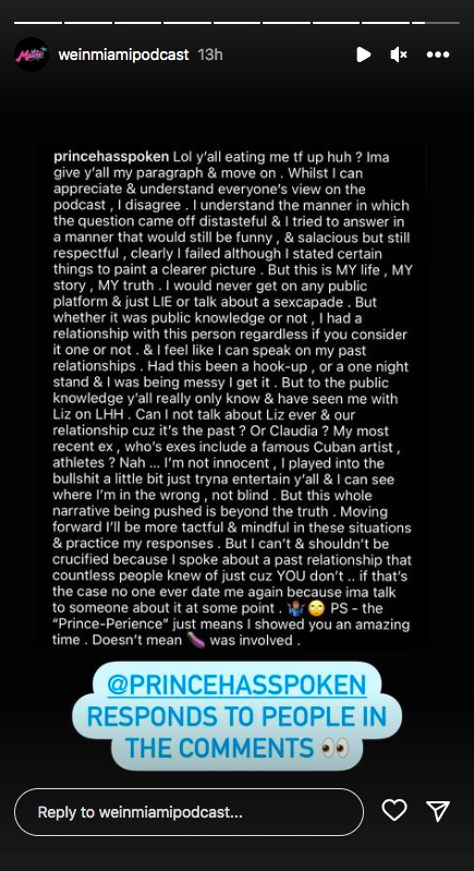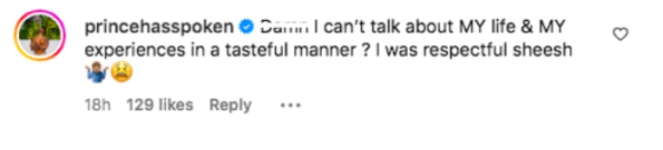 While it seems the social media personality believed his comments were in good taste, many online users disagreed. Commenters condemned Prince for sharing the private moments, blasted him for “talking too much,” and accused him of “clout chasing.”