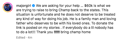 “We are asking for your help … $60k is what we are trying to raise to bring Champ back to the states. This situation is unfortunate and he does not deserve to be treated any kind of way for doing his job. He is a family man and loving father who deserves to be with his loved ones. To donate the link is posted on my stories. If everybody do a lil nobody has to do a lot!!! Thank you !!!!!! bring champ home”