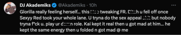 GloRilla’s comment about unblocking Kai then seems to have triggered a response from Akademiks, real name Livingston Allen, 32. The commentator unleashed a slew of obscene statements towards the rapper, writing to his X (formerly Twitter) account things like: