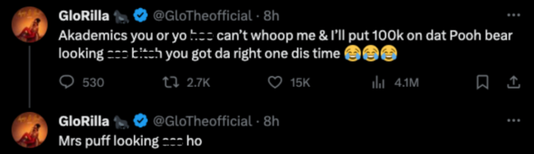“Akademics you or yo h*e can’t whoop me & I’ll put 100k on dat Pooh bear looking a** b***h you got da right one dis time”