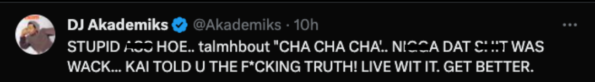 “STUPID A** H**.. talmhbout “CHA CHA CHA’.. NIGGA DAT SH*T WAS WACK… KAI TOLD U THE F*CKING TRUTH! LIVE WIT IT. GET BETTER.”