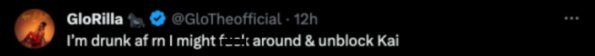 “I’m drunk af rn I might f**k around & unblock Kai”