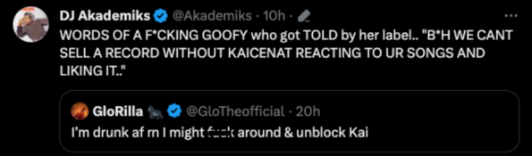 “WORDS OF A F*CKING GOOFY who got TOLD by her label.. “B*H WE CANT SELL A RECORD WITHOUT KAICENAT REACTING TO UR SONGS AND LIKING IT..”