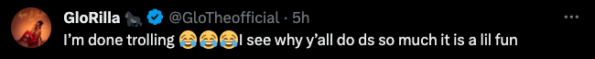 “I’m done trolling I see why y’all do ds so much it is a lil fun”