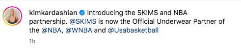“Introducing the SKIMS and NBA partnership. @SKIMS is now the Official Underwear Partner of the @NBA, @WNBA and @Usabasketball”
