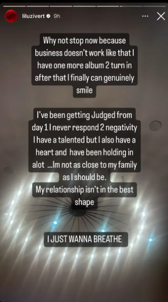 “Why not stop now because business doesn’t work like that I have one more album 2 turn in after that I finally can genuinely smile…I’ve been getting Judged from day 1 I never respond 2 negativity I have a talented but I also have a heart and have been holding in alot …Im not as close to my family as I should be. My relationship isn’t in the best shape I JUST WANNA BREATHE.”