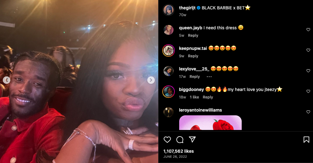 It’s also important to note that not all posts pertaining to Uzi have been removed from the Miami native’s feed. JT kept up a post she made celebrating the “Just Wanna Rock” rapper’s “Pink Tape” album, which was released earlier this year. Additionally, the music star also kept a couple of photos of her and her possibly estranged beau from their BET appearance in June.