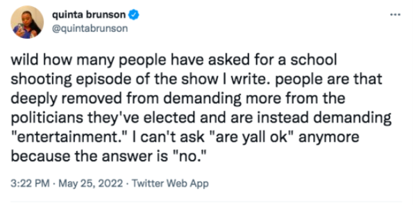 “wild how many people have asked for a school shooting episode of the show I write. people are that deeply removed from demanding more from the politicians they’ve elected and are instead demanding “entertainment.” I can’t ask “are yall ok” anymore because the answer is “no.”