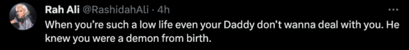 “When you’re such a low life even your Daddy don’t wanna deal with you. He knew you were a demon from birth.”