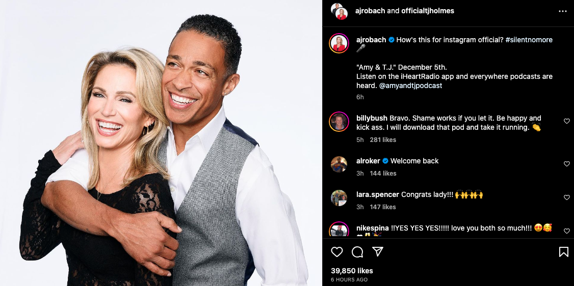 In the reveal posted to Amy Robach and T.J. Holmes’ IG accounts, they shared an image of themselves hugged up with the caption: