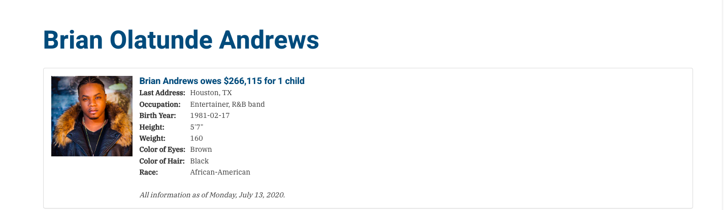 Recently, a user on the social media platform formally known as Twitter posted what appeared to be a screenshot of the Texas Child Support Evaders website, which lists individuals who are behind on their child support payments. It didn’t take long for people to spot a familiar face on the infamous list, 43-year-old Brian Olatunde Andrews, who now professionally goes by Brian Angel. The entertainer is most known for his time as a member of the R&B group Day26. According to the listing, Brian Angel owes $266,115 for one child.