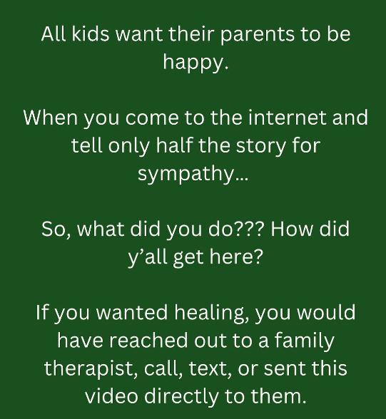 “All kids want their parents to be happy. When you come to the internet and tell only half the story for sympathy…So what did you do??? How did y’all get here? If you wanted healing, you would have reached out to a family therapist, call, text, or sent this video directly to them.”