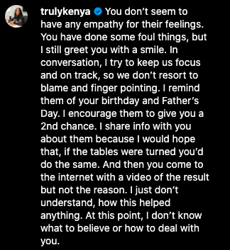 “I remind them of your birthday and Father’s Day. I encourage them to give you a 2nd chance. I share info with you about them because I would hope that, if the tables were turned you’d do the same. And then you come to the internet with a video of the result but not the reason. I just don’t understand, how this helped anything. At this point, I don’t know what to believe or how to deal with you.”
