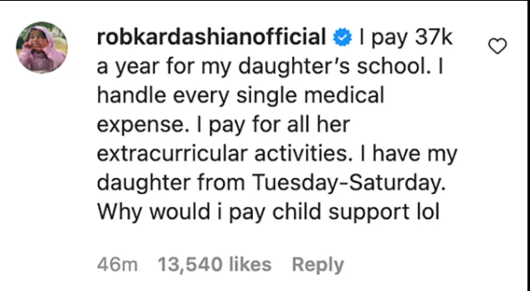 “I pay 40k a year for my son school & he lives w me mon-sat. Why would I pay child support lol,”