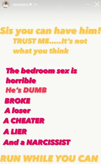 Nene Leakes Posts Cryptic Message, Seemingly Warning Another Woman About A Cheating “Narcissist” w/ Bad Sex: ‘RUN WHILE YOU CAN’
