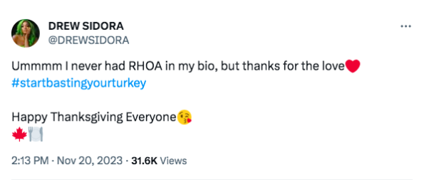 “Ummmm I never had RHOA in my bio, but thanks for the love [heart emoji] #startbastingyourturkey”