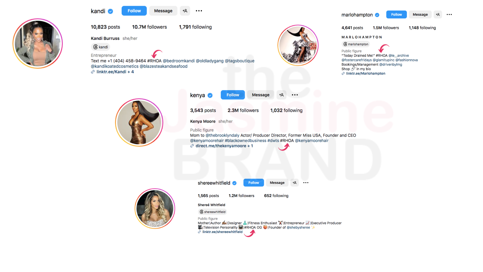 Kandi Burruss, Kenya Moore, Shereé Whitfield, and Marlo Hampton all currently have “#RHOA” mentioned on their accounts. However, insiders close to Bravo also informed us that there’s a high chance that no more than three current peach holders will be offered a return contract, which means there might be more housewives adjusting their media pages soon.