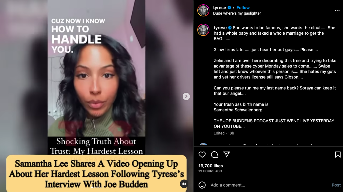 It does not appear Gibson made any further comments. Elsewhere on his social page, Tyrese suggested that he was uncomfortable with the line of questioning during his sit down with Joe Budden in the first place. He wrote while promoting the interview: