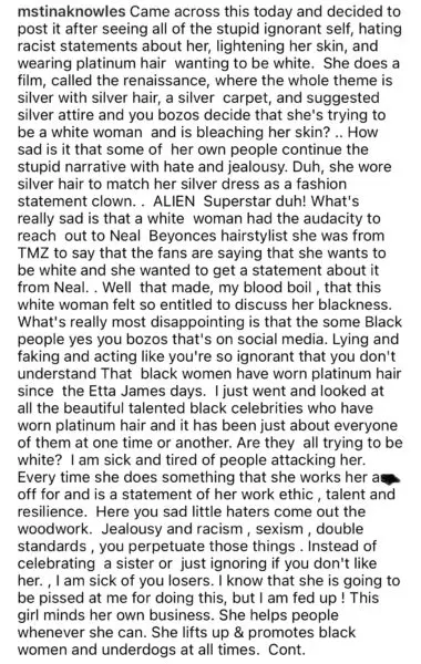 “Came across this today and decided to post it after seeing all of the stupid ignorant self, hating racist statements about her, lightening her skin, and wearing platinum hair wanting to be white. She does a film, called the renaissance, where the whole theme is silver with silver hair, a silver carpet, and suggested silver attire and you bozos decide that she’s trying to be a white woman and is bleaching her skin?..”