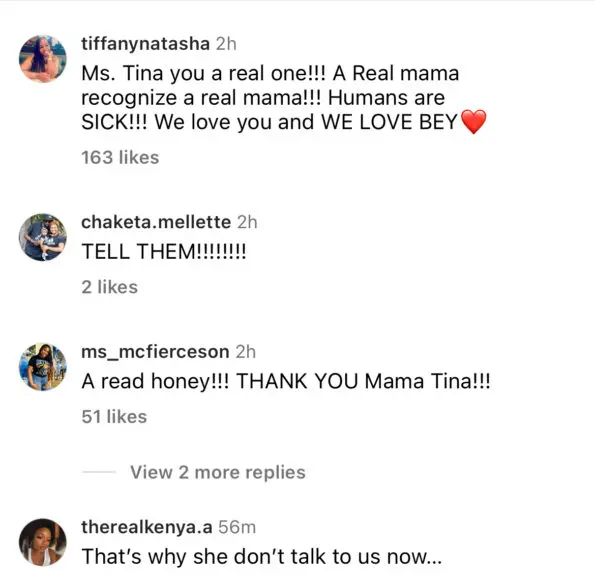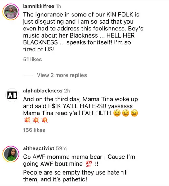 Tina also mentioned that a media outlet reached out to Beyoncé’s hairstylist for a comment on the reactions haters had about her hair, which made her “blood boil.”
