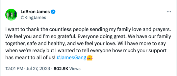Update #2: (Jul. 27, 2023): LeBron James is thankful for the people that rallied around his family during a very scary moment.