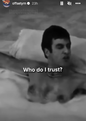 For Offset’s part, the former Migos member shared a message about trust and building. The rapper, real name Kiari Kendrell Cephus, 31, posted a clip from the iconic “Scarface” movie where Tony Montana stated: