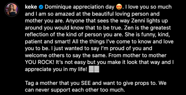 “Dominique appreciation day. I love you so much and I am so amazed at the beautiful loving person and mother you are. Anyone that sees the way Zenni lights up around you would know that to be true.”