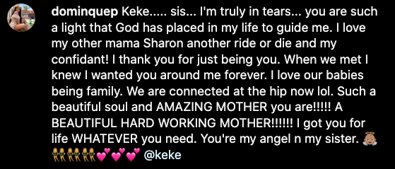 “Keke….. sis… I’m truly in tears… you are such a light that God has placed in my life to guide me. I love my other mama Sharon another ride or die and my confidant! I thank you for just being you. When we met I knew I wanted you around me forever. I love our babies being family. We are connected at the hip now lol. Such a beautiful soul and AMAZING MOTHER you are!!!!! A BEAUTIFUL HARD WORKING MOTHER!!!!!! I got you for life WHATEVER you need. You’re my angel n my sister.”
