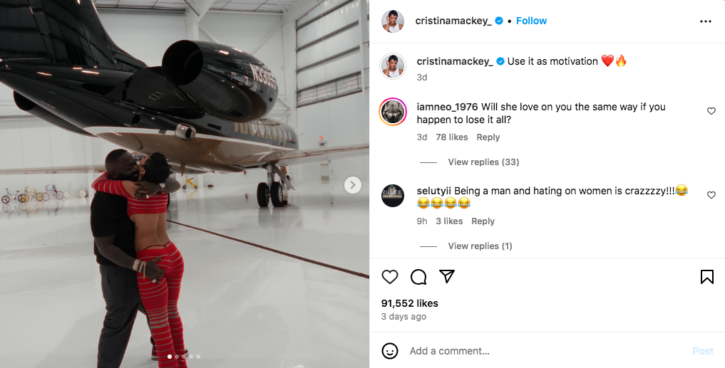 In the original post, Rick Ross and Cristina Mackey are seen hugged up outside of a private jet, as she captioned the photo,