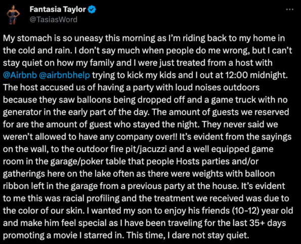 “My stomach is so uneasy this morning as I’m riding back to my home in the cold and rain. I don’t say much when people do me wrong, but I can’t stay quiet on how my family and I were just treated from a host with @Airbnb @airbnbhelp trying to kick my kids and I out at 12:00 midnight.”