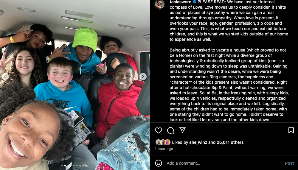 “PLEASE READ: We have lost our internal compass of Love! Love moves us to deeply consider, it shifts us out of places of sympathy where we can gain a real understanding through empathy. When love is present, it overlooks your race, age, gender, profession, zip code and even your past. This, is what we teach our and exhibit before children, and this is what we wanted kids outside of our home to experience as well.”
