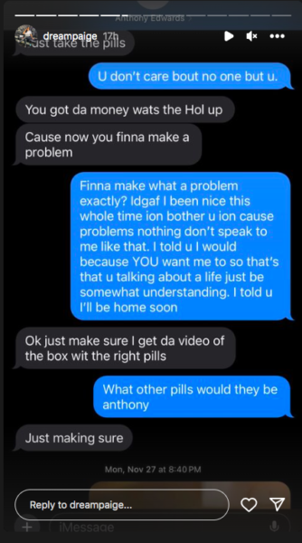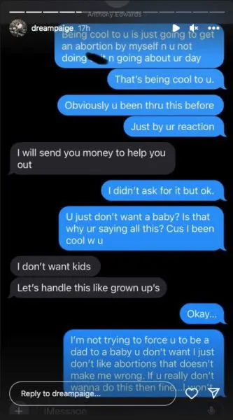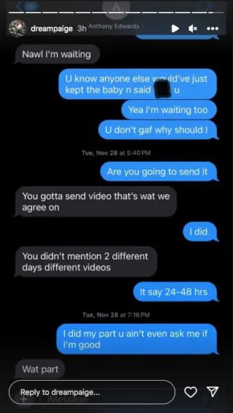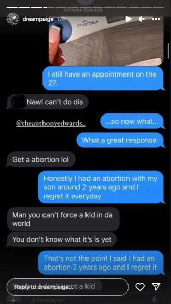 The social media star posted the alleged text conversation between her and Anthony Edwards via her IG stories, which appeared to show her sending the basketball shooting guard a photo of a positive pregnancy test. As a response, Edwards followed with,
