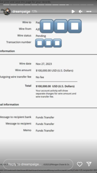 Additionally, the released screenshots included an invoice for a wire transfer of $100,000 allegedly sent from Edwards to Paige Jordae.