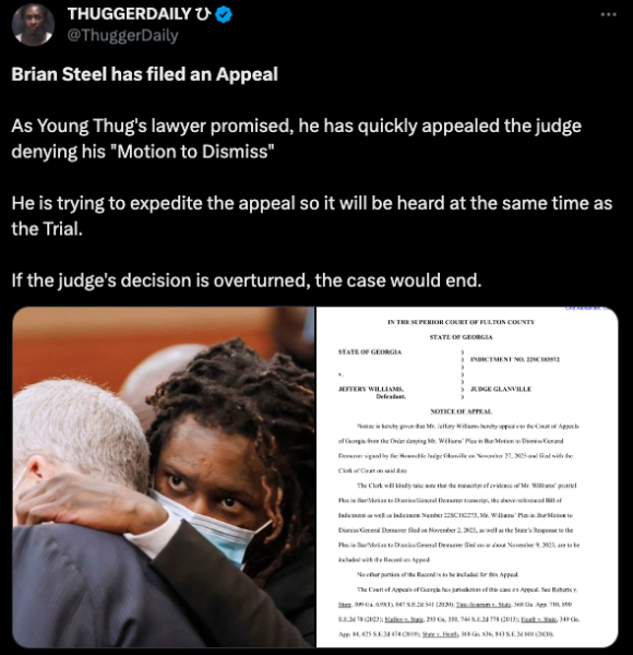 Legal documents show that on Monday (December 18th), Young Thug, born Jeffery Williams, filed a motion to have his case dismissed. Reportedly his lawyer, Brian Steel, submitted the paperwork on his behalf and is seeking to overturn Judge Glanville’s prior rejection of his first motion to dismiss. One social media outlet covering the case reported that Steel is additionally attempting to expedite the appeal so that it can hopefully be heard by an appellate court judge while the trial is going on.