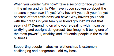 “When you wonder ‘why now?’ take a second to face yourself in the mirror and think: Why haven’t you spoken up about the abusers in your own life yet? Why haven’t you quit your job yet because of that toxic boss you have? Why haven’t you dealt with the creeps in your family or friend groups? It’s not that easy, right? Depending on who you’re dealing with, it can be terrifying and outright dangerous! Now imagine it being one of the most powerful, wealthy, and influential people in the music business. Supporting people in abusive relationships is extremely challenging and dangerous! I did my best.”
