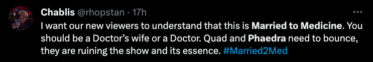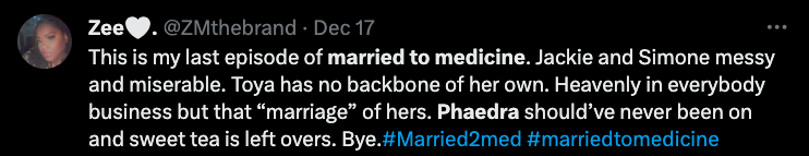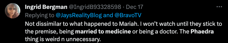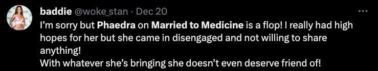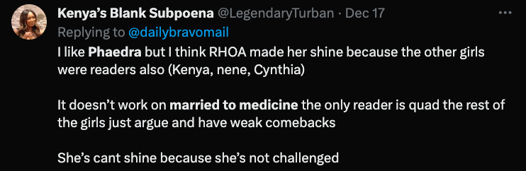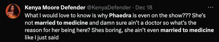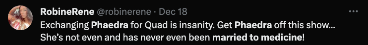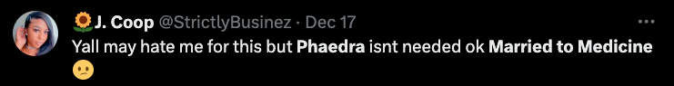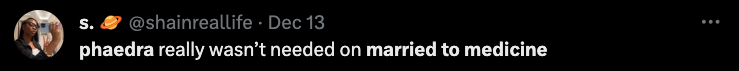 “My thoughts on Phaedra joining the cast of Married to Medicine is girl get you an easy coin cause that what it seems like it is. I don’t understand the connection or parallel, unless she’s representing one of the ladies in the malpractice situation I don’t understand the connection. She’s not married to medicine.”