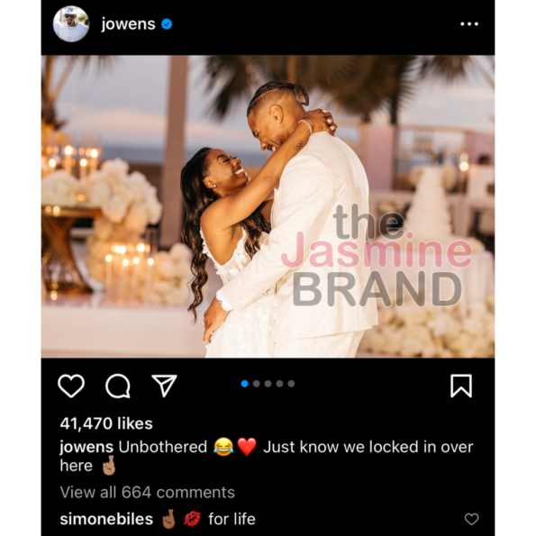 Despite what the internet thinks, it seems that Owens and Biles are all good. Though he didn’t speak directly on the situation, the NFL player uploaded a photo of him and his wife following the controversy with the caption: