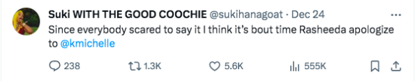 “Since everybody scared to say it I think it’s bout time Rasheeda apologize to @kmichelle”