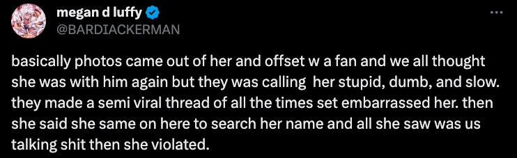 “basically photos came out of her and offset w a fan and we all thought she was with him again but they was calling her stupid, dumb, and slow. they made a semi viral thread of all the times set embarrassed her. then she said she came on here to search her name and all she saw was us talking sh*t then she violated.”