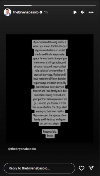 Bryan Abasolo released a statement to his IG stories about the separation, writing: