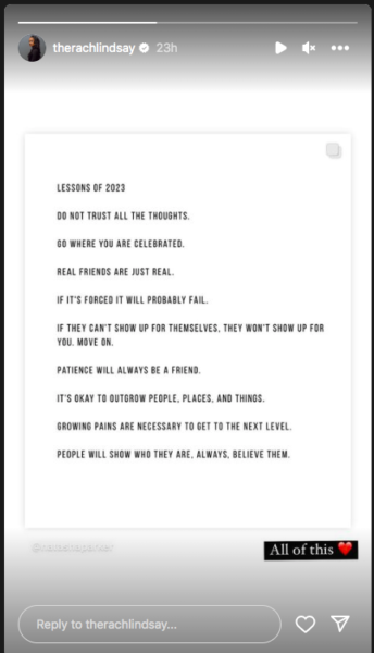 Rachel has yet to address the split, but yesterday (Jan. 1), before Bryan submitted paperwork to legally end their union, the former Extra correspondent shared a post online seemingly hinting at their breakup. In part, the post read,