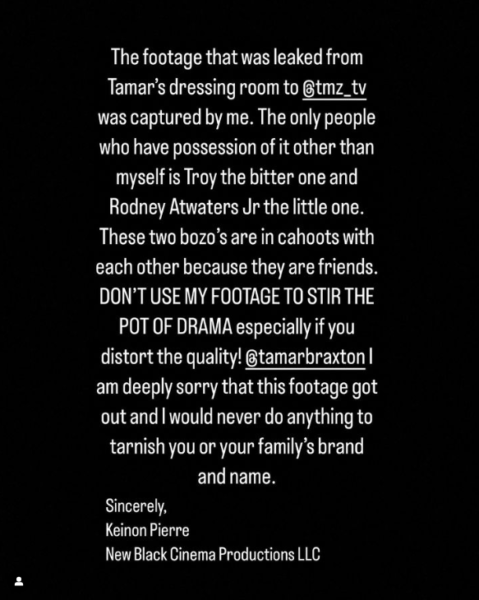 “DON’T USE MY FOOTAGE TO STIR THE POT OF DRAMA especially if you distort the quality! @tamarbraxton I am deeply sorry that this footage got out and I would never do anything to tarnish you or your family’s brand and name.”